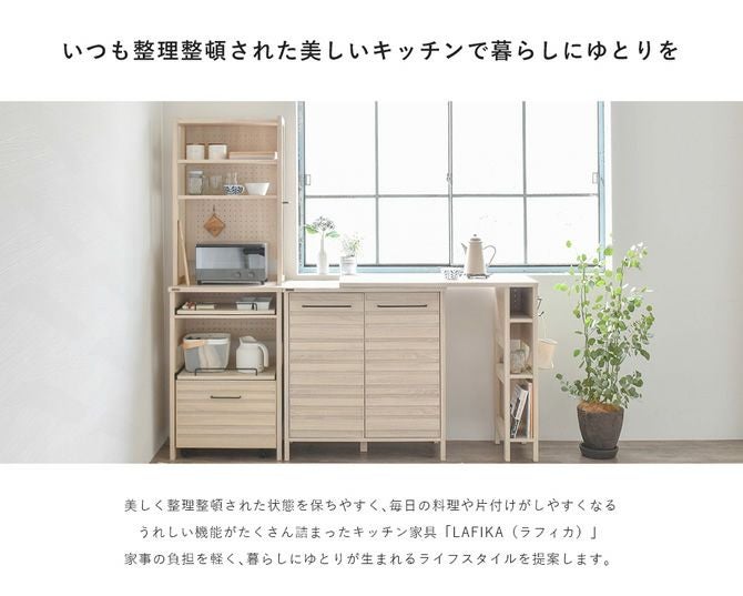 毎日の料理や片付けがしやすくなる、うれしい機能がたくさん詰まったキッチン家具[レンジラック・キッチンキャビネット・オプションテーブル]の3点セット。家事の負担を軽く、暮らしにゆとりが生まれるライフスタイルを提案するキッチン家具セットです。