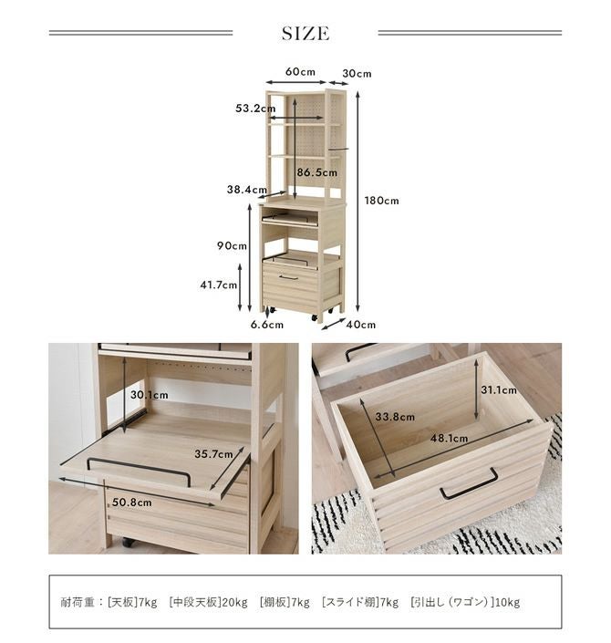【耐荷重】 【レンジラック】天板7kg、中段天板20kg、棚板7kg、スライド棚7kg、引出し(ワゴン)10kg