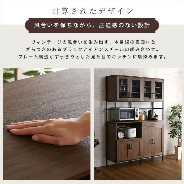 ヴィンテージの風合いを生み出す、木目調の表面材とざらつきのあるブラックアイアンスチールの組み合わせ。フレーム構造なので圧迫感を感じさせず、キッチンに馴染みます。