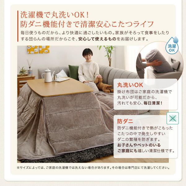 木目がオシャレな、こたつに見えないインテリア性がお部屋にマッチ。テーブルの脚部や布団の丈が調節できるので、ロースタイルでの使用や、シーズンオフはリビングテーブルとしてもお使い頂けます。掛布団はとろける手触りの贅沢フランネル素材、ご自宅で洗濯も可能です。