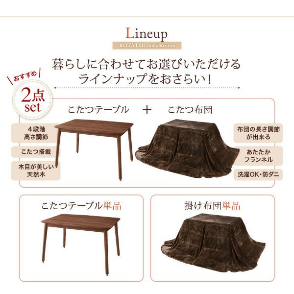おすすめの2点セットなら届いてすぐに暖まる。テーブルも掛け布団も伸縮式だから、ライフスタイルに合わせて自由にお使いいただけます。