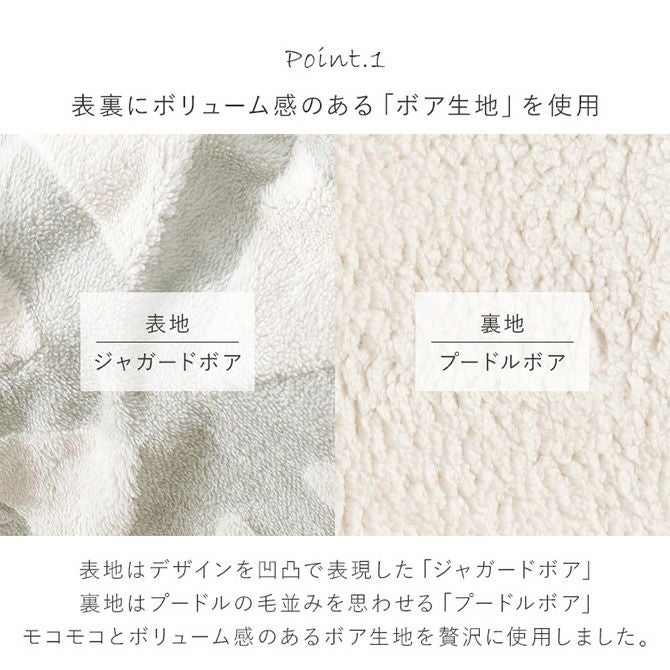 表地はジャガードボア、裏地はプードルボアを使用しボリューム感のある生地が優しく包み込んでくれます。自宅で洗濯可能なのも嬉しいポイント!
