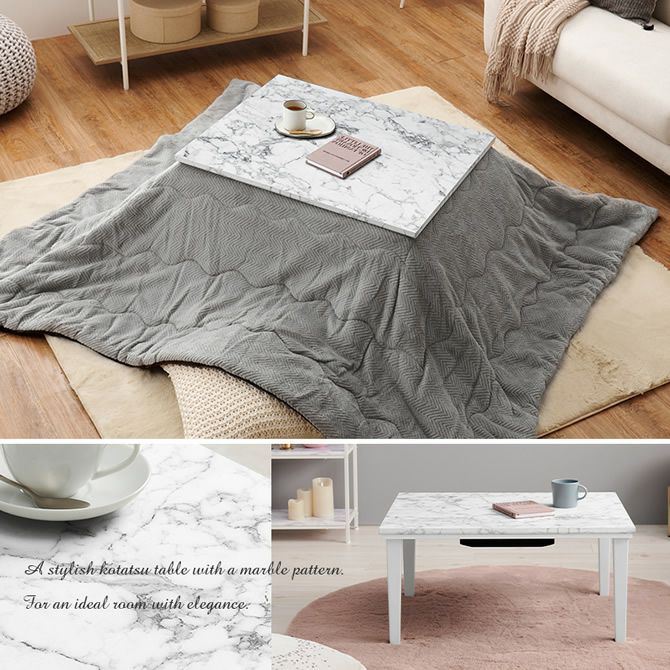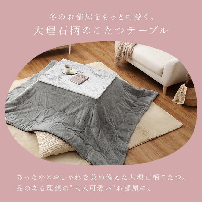 おしゃれで可愛くさらに高級感のある大理石柄のこたつテーブル。なめらかな肌触りのかさばらない掛け布団セット。