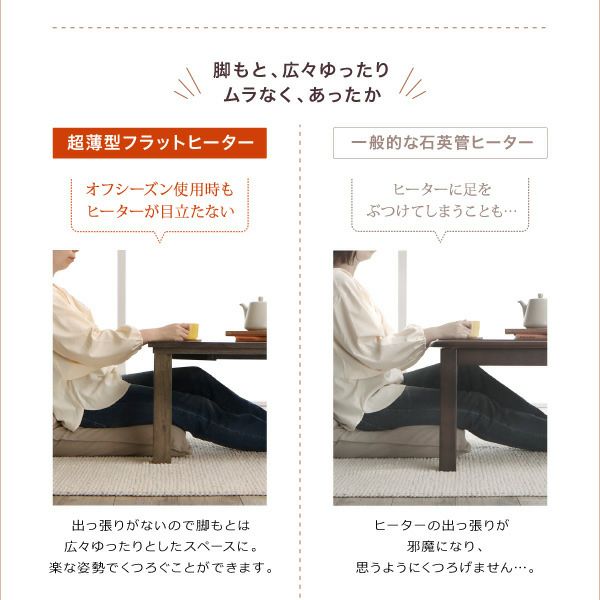 足元が広くてじんわり暖かいから、ついウトウトしてしまうほど快適。天板とほぼ同じサイズの板が土台になった二重天板構造。こたつ布団がピッタリ収まって角が出ないので、小さなお子様のいるご家庭でも安心してご使用いただけます。