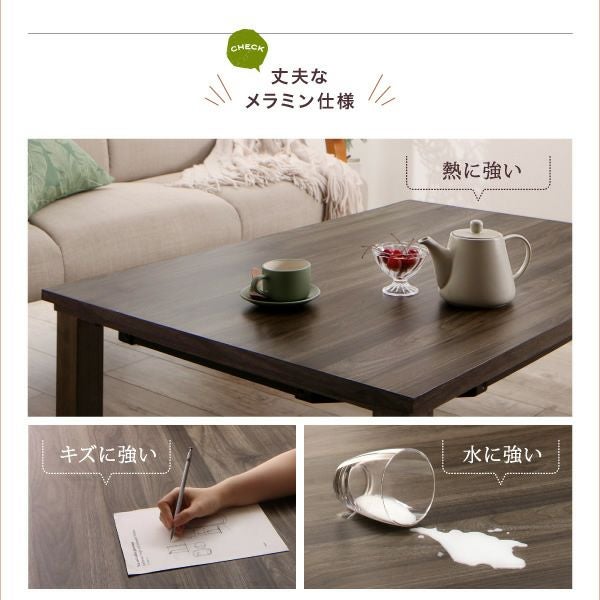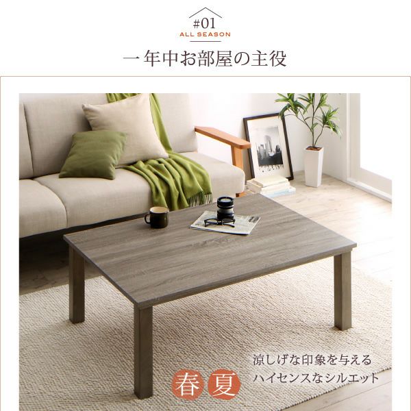 普段はテーブル、冬場はこたつテーブルとして一年中活躍してくれるモダンデザインテーブル。ヒーターはフラットタイプなのでヒーターが目立たず邪魔にならないのはもちろん、こたつ全体をムラなく温めてくれます。