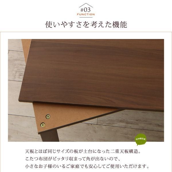 足元が広くてじんわり暖かいから、ついウトウトしてしまうほど快適。天板とほぼ同じサイズの板が土台になった二重天板構造。こたつ布団がピッタリ収まって角が出ないので、小さなお子様のいるご家庭でも安心してご使用いただけます。