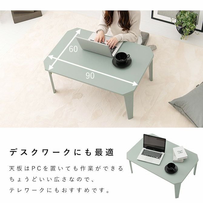 デスクワークなどちょっとした作業机としてもちょうどよい90×60cmサイズ。八角形の天板はスタイリッシュでお部屋のアクセントにもなると同時に、お子様がいるご家庭には角が無いデザインで安心に設置して頂けます。