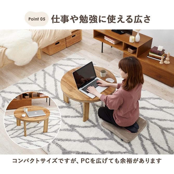限られたお部屋にも置きやすいコンパクトな円形こたつテーブル。脚は折りたたみ可能なので使わない時やシーズンオフの際にも場所を取りません。