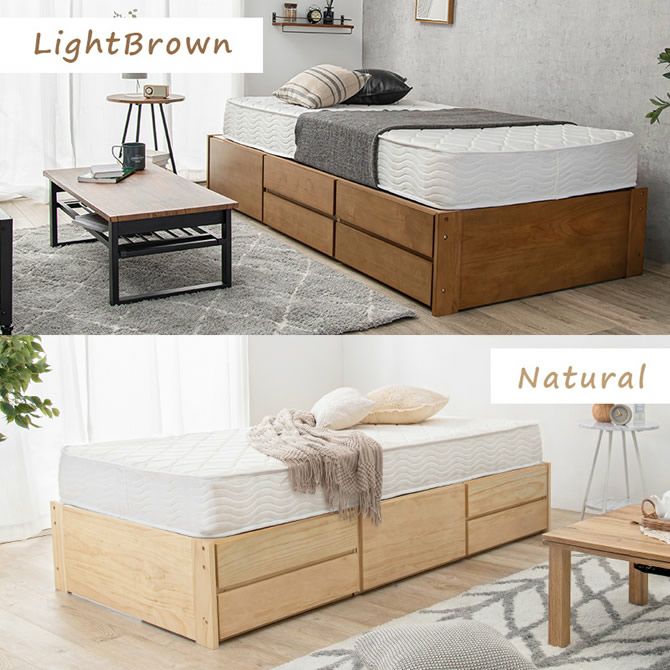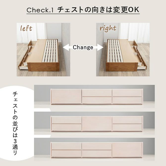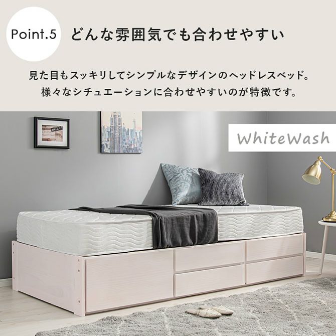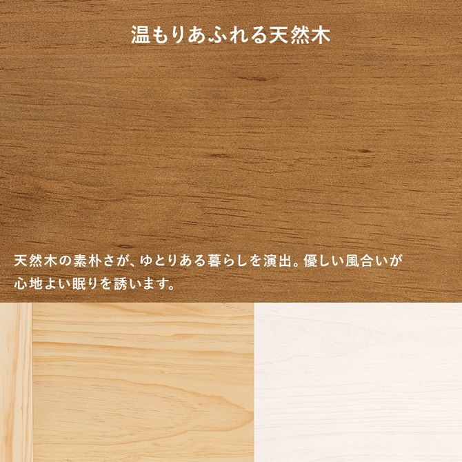 天然木のぬくもりを感じられる大容量収納付きのベッド。ヘッドレスベッドなので見た目もスッキリ。引き出しの左右の向きや、浅型・深型の位置もカスタマイズ可能です。