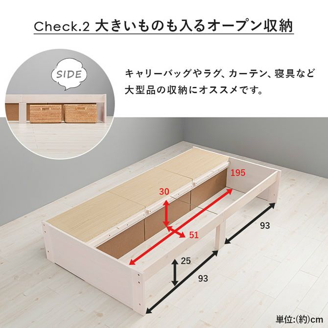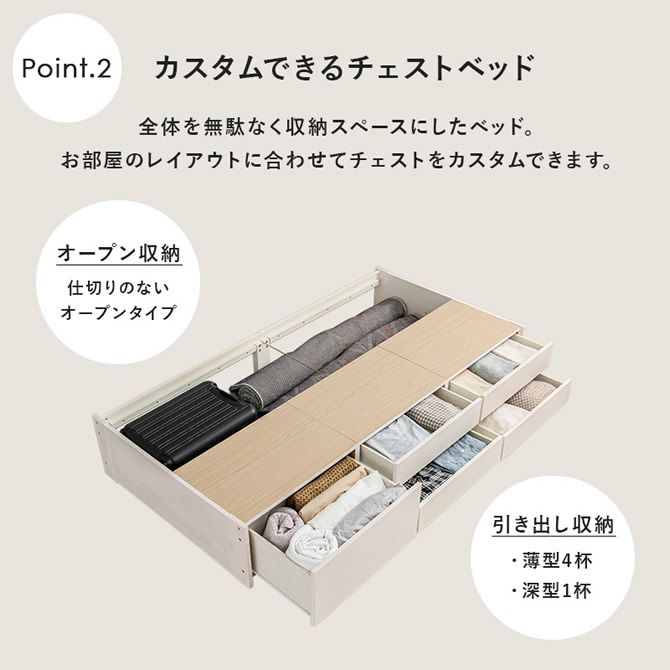深型1杯、浅型4杯の引き出しと、長物可能な収納エリアを備えた大容量収納ベッド。引き出し部分は完成状態でお届けなので組立の負担を軽減!