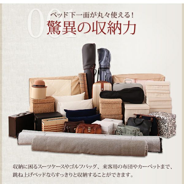 ヘッドボードのないすっきりとしたデザインで、ベッド内部が一面収納エリアとして使用できるので、普段使わないスーツケースや季節物の収納にも便利。安心の日本製でガス圧式なので女性でも簡単に上げ下げが可能。