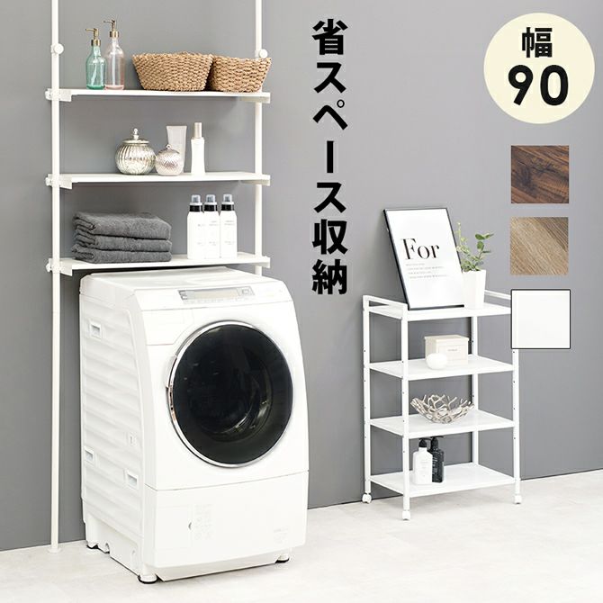 フレームが細いのでわずかなスペースでも設置が可能。一般的なドラム式、縦型のどちらの洗濯機にも対応でき、棚板の高さが調節できるので、縦型洗濯機の蓋を開ける際にも邪魔になりません。