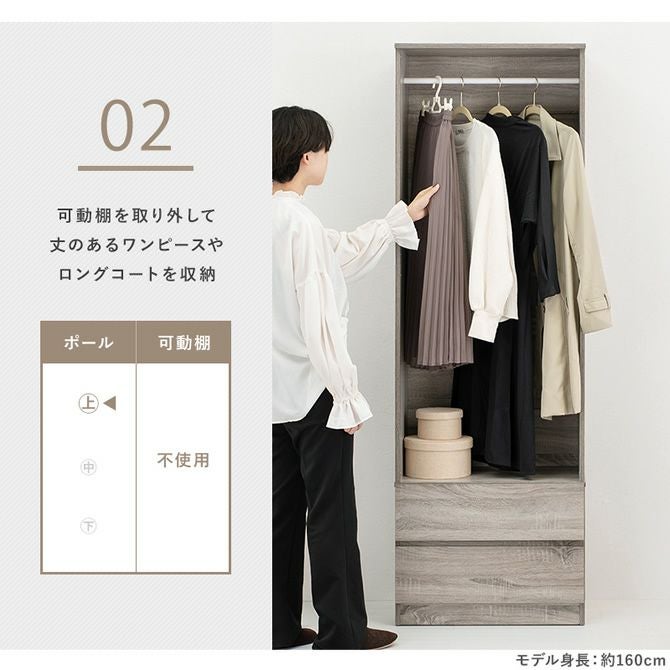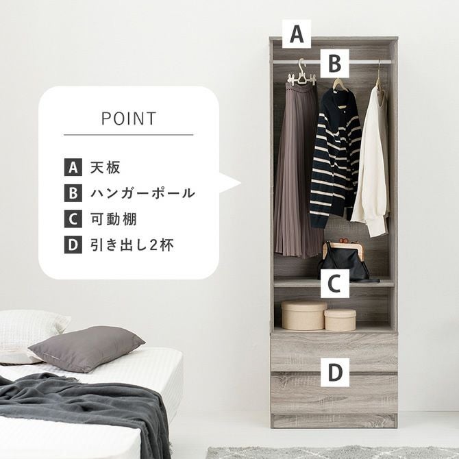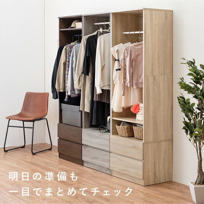 ハンガーラックと引出し収納がこれ1台で完結!サッと取り出せるようにハンガーポール部分はオープンになっているので忙しい朝の身支度もスムーズに。下段の隠せる引出し収納が2杯付!