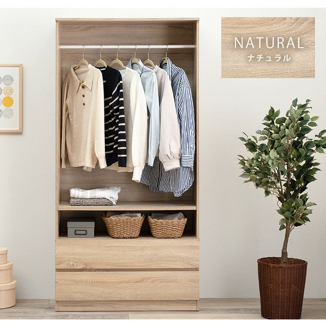 ハンガーラックと引出し収納がこれ1台で完結!サッと取り出せるようにハンガーポール部分はオープンになっているので忙しい朝の身支度もスムーズに。下段の隠せる引出し収納が2杯付!