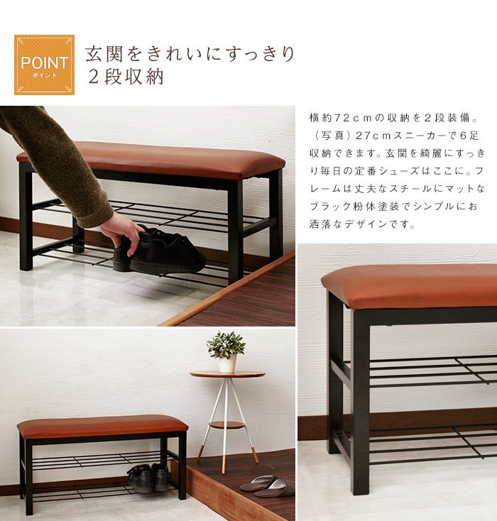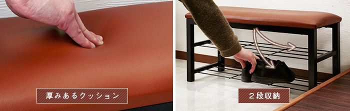 玄関であふれる靴や小物を2段ある収納スペースに収納しすっきり。座面はお手入れの楽々なPVC仕様なので、水に濡れても簡単に拭き取っていただけます。座面は丁度いい40cm高で靴の脱ぎ履きにも活躍します。