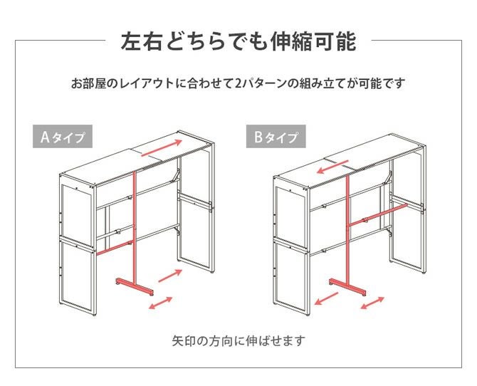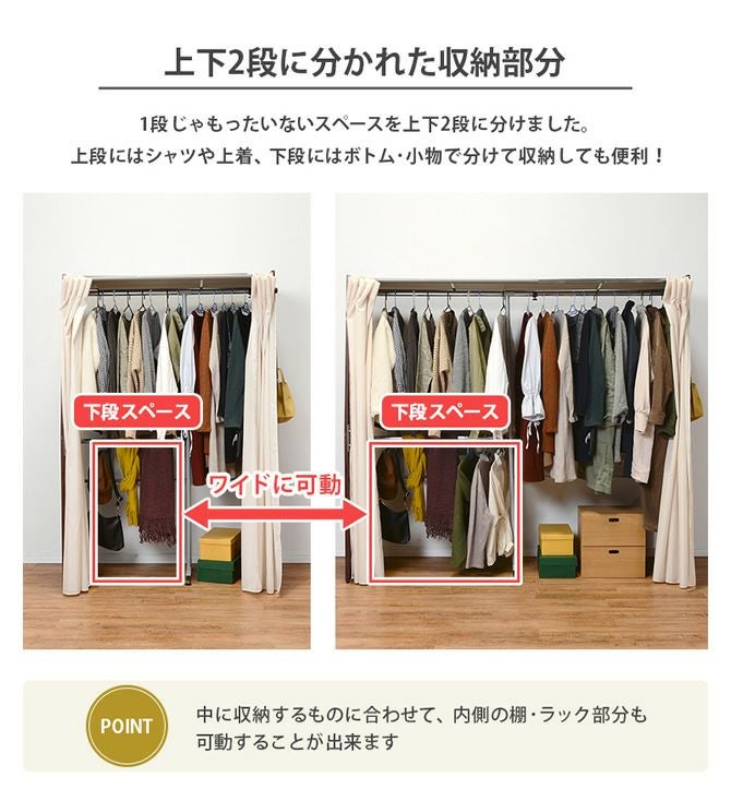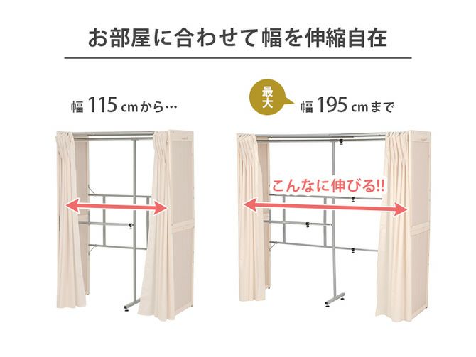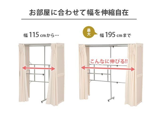 設置するだけで壁面がクローゼットに早変わり!カーテン付きなので見せたく無い時はサッと目隠しが可能。衣類の量やお部屋のサイズに合わせて最大幅195cmまで伸縮可能です!