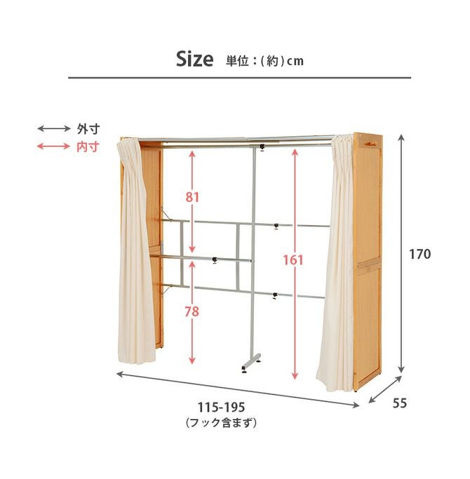 【サイズ】 (約)幅115-195(フック含まず)×奥行55×高さ170cm