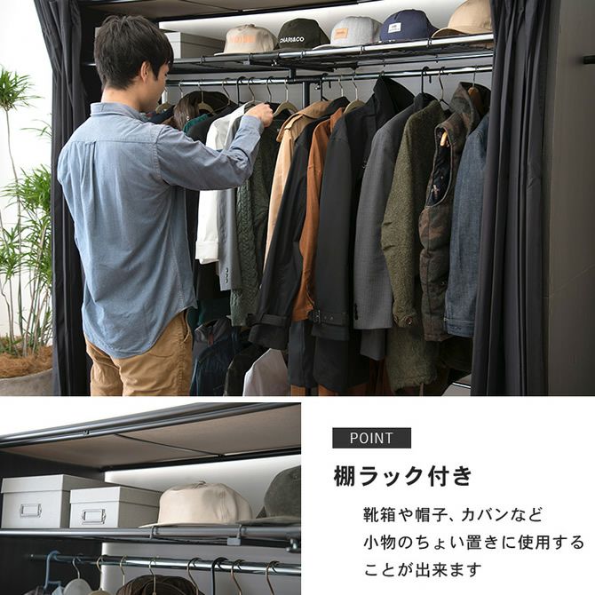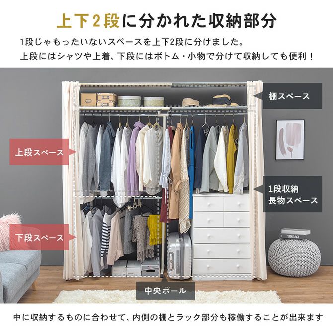 お部屋の空いてるスペースに設置するだけでクローゼットに早変わり!カーテンで目隠しできるので普段使わないものも見せずに収納!衣類の量やお部屋のサイズに合わせて最大幅195cmまで伸縮可能です!上段の棚付きタイプです。