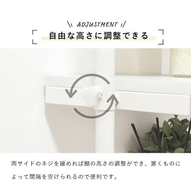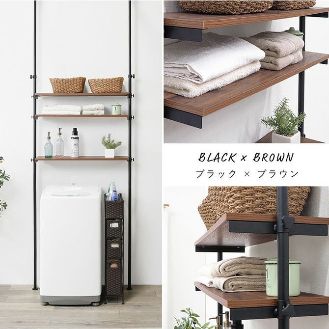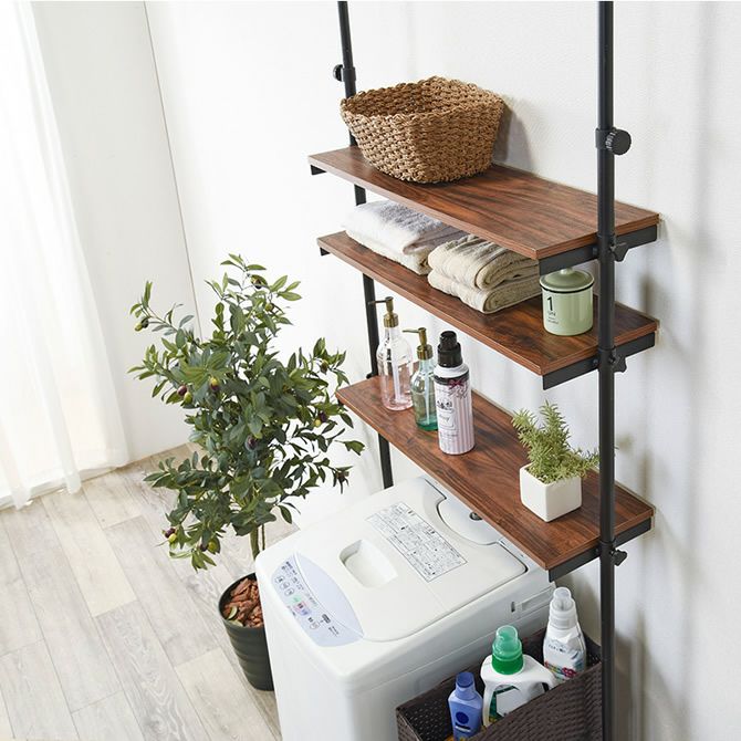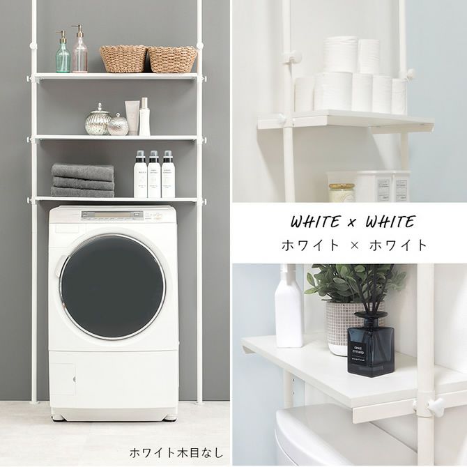 洗濯機の上のスペースを有効活用し、置き場所に困る洗剤や衣類などを収納可能。天井への突っ張りタイプなので安定感もあり、3枚の棚板は身長や収納物に合わせて高さ調節が可能です。