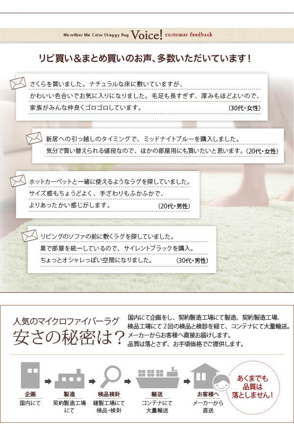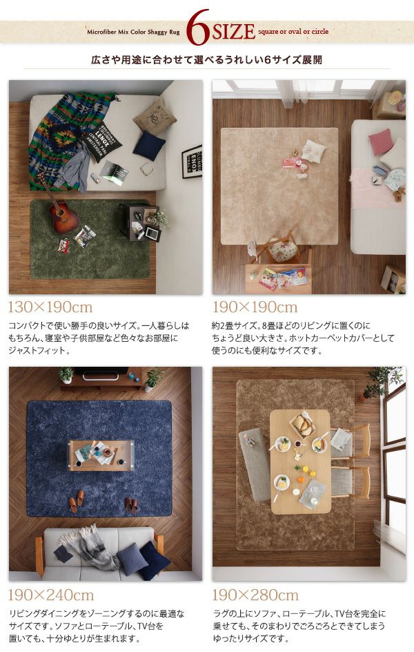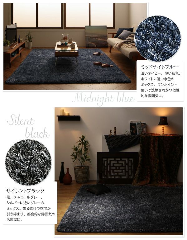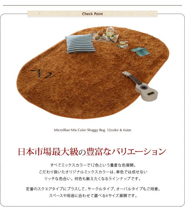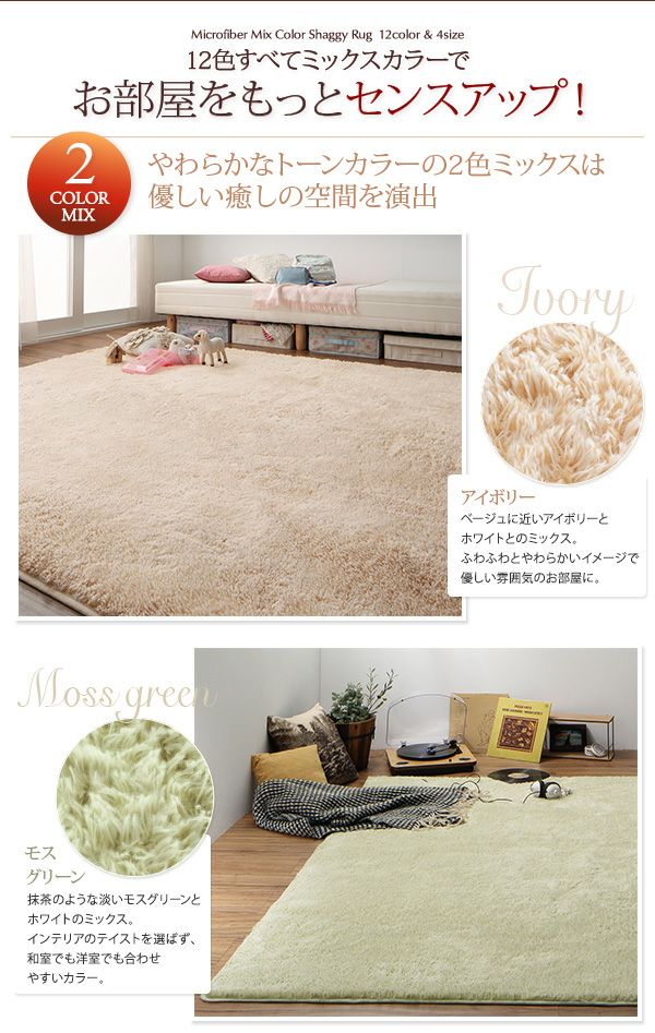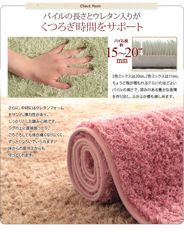 ミックス糸が織りなす、贅沢な表情ミックスカラーシャギー。夏涼しく、冬あったかマイクロファイバー仕様でオールシーズンOK!!(ホットカーペット・床暖房対応)。ちょうど指が埋もれるぐらいの長すぎず短すぎない、ほどよいパイルの長さで、深みのある豊かな表情を作り出すだけでなく、ふかふか感も楽しめます。床からの底冷えからも守ってくれます。