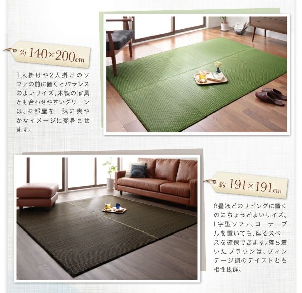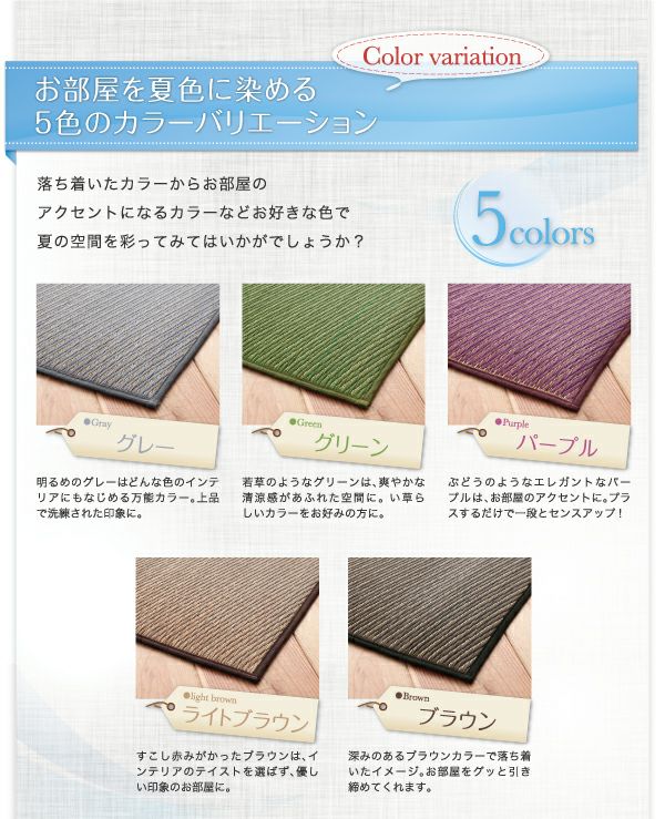い草と言えば緑色のイメージですが、グレーやパープル、ブラウンなど全5色展開。サイズも豊富なのでお部屋に合うピッタリサイズをお選びください。