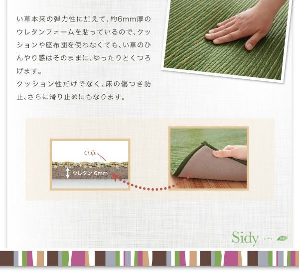 い草本来の弾力性に加えて、約6mm厚のウレタンフォームを貼っているので、クッションや座布団を使わなくても、い草のひんやり感はそのままに、ゆったりとくつろげます。クッション性だけでなく、床の傷つき防止、さらに滑り止めにもなります。