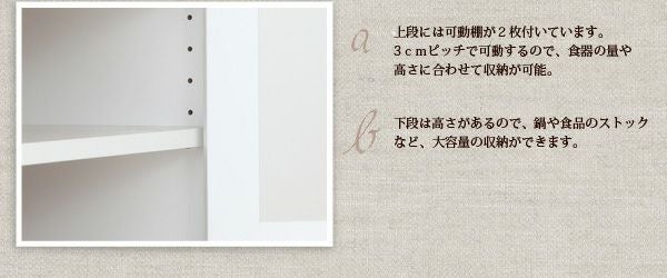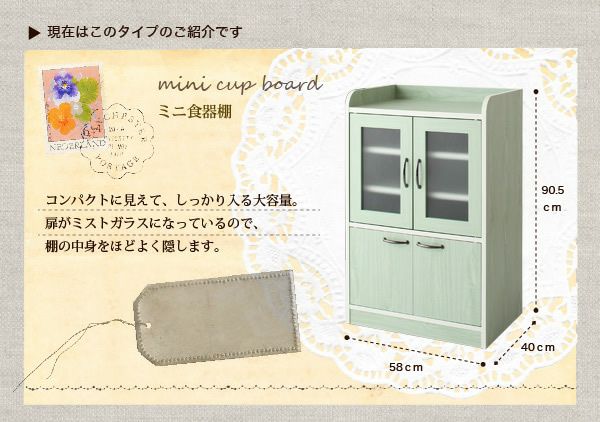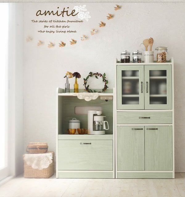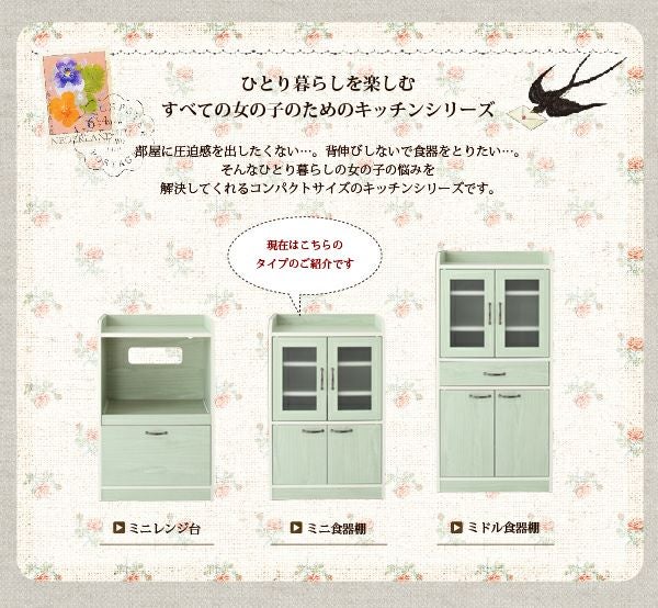 お部屋に圧迫感を与えずに食器などの取り出しも楽々な高さのコンパクトなキッチン収納シリーズ。パステルグリーンorホワイトの2色のカラー展開で組立不要の嬉しい完成品!アンティーク風の取っ手と角の丸みが女の子らしい雰囲気に仕上げました♪