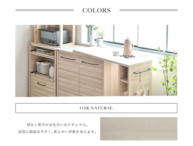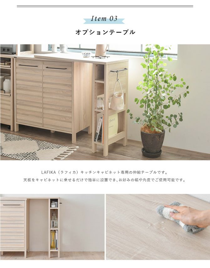 毎日の料理や片付けがしやすくなる、うれしい機能がたくさん詰まったキッチン家具[レンジラック・キッチンキャビネット・オプションテーブル]の3点セット。家事の負担を軽く、暮らしにゆとりが生まれるライフスタイルを提案するキッチン家具セットです。