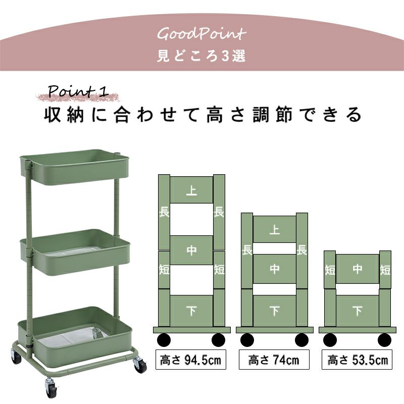リビング、キッチン、子供部屋など色んな場所で使えるベンチなマルチワゴン。キャスター付なので移動も簡単で、収納物に合わせて高さ変更も可能です。