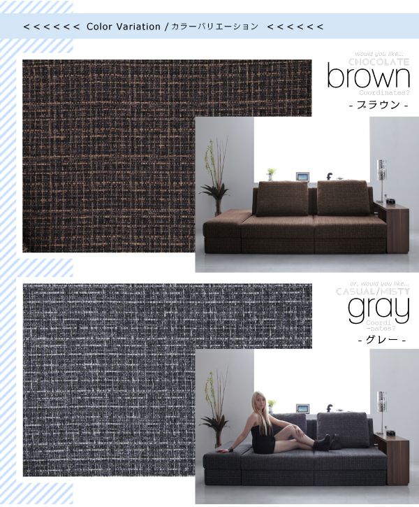 高級感あふれる張地は、糸に強弱があり陰影がつきやすく立体的に見えるお洒落な生地です。色もモダンに決まるグレーとブラウンの2色展開で、ウォルナット柄の肘掛棚ともぴったりです。