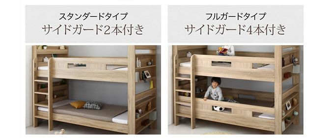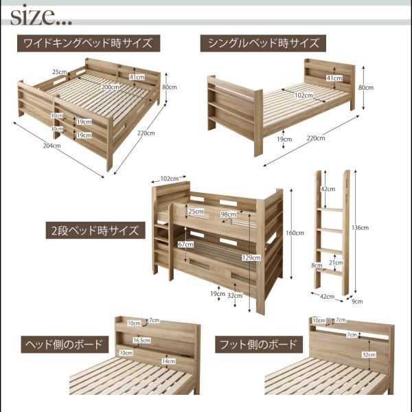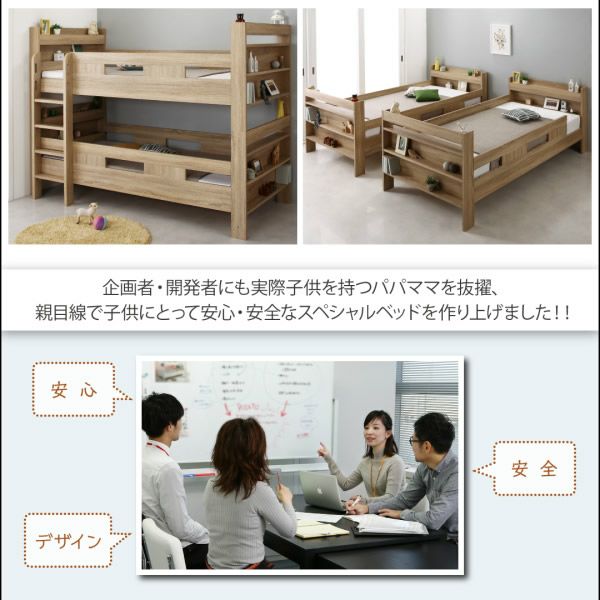 親目線で安心・安全なスペシャルベッドを作り上げました お子様が生まれたその日から成長するまで 添い寝にピッタリ、ワイドキングサイズ ヘッドボードもマットレスもピッタリ 取り外し可能なサイドガード付で安心 しっかり丈夫な2段ベッド 厚み、重みのある構造で揺れに強い 耐荷重はそれぞれ約150kg コンパクトで上部なハシゴ ロータイプで子供の顔が見られる シングルベッド×2台としても利用可能 コンセント付きヘッドボード・棚付きのフットボード 通気性のよい上部なすのこ