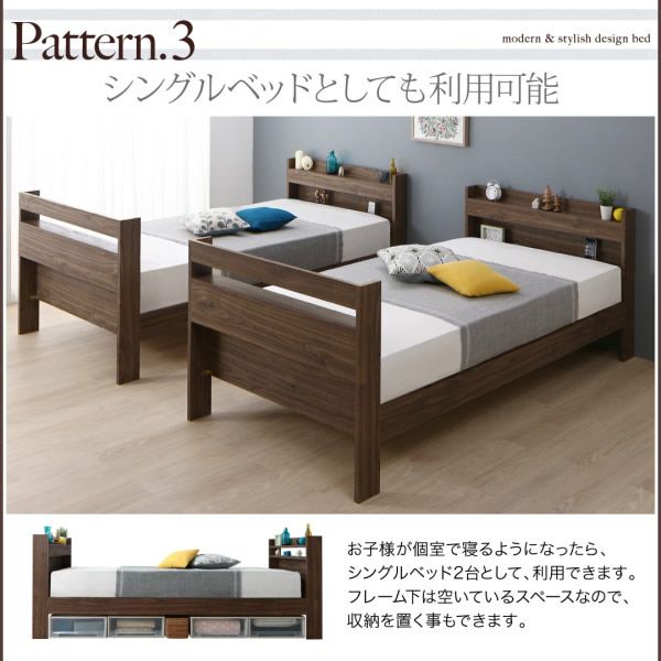 お子様が小さいうちは2台横並びで連結して家族全員が一緒に寝られるワイドサイズに!ある程度大きくなったら2段ベッド、もしくはシングル1台ずつに分割して子供部屋へ!成長に合わせて長く使える万能ベッドです。