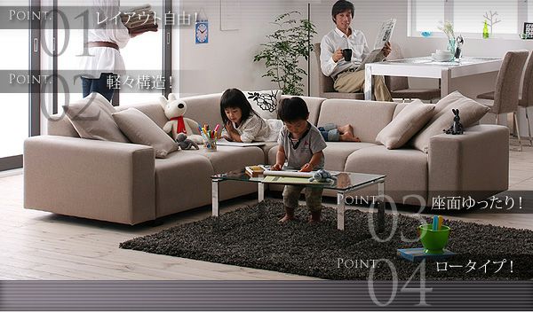 家族みんなで座れるシートを確保しながら、サイズを215cm×215cmコンパクトに抑えました!それぞれが独立しているソファーなので、右コーナー、左コーナーなどの配置の変更も可能。大型のソファーでありながら部屋に圧迫感を感じないロータイプなので、目線が奥に抜けていくので、狭さを感じさせません。