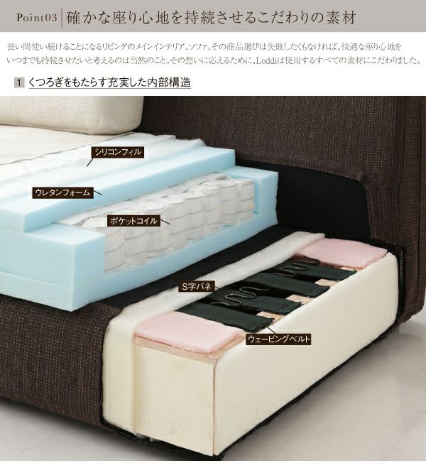 内部構造(シリコンフィル、ウレタンフォーム、ポケットコイル、S字バネ、ウェービングベルト)
