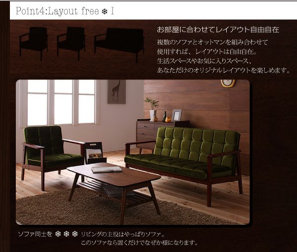 どこか懐かしいレトロな雰囲気なのに、決して色褪せることのないソファー。光の反射で生まれる独特の光沢が高級感を感じさせ、肘掛けや脚部には天然木を使用してます。細部のデザインまでこだわった設計で、シリーズで組み合わせたレイアウトもオススメです。