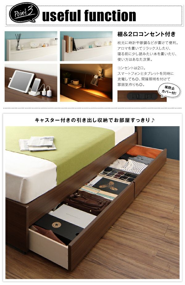 3.使いやすい便利な機能:棚・2口コンセント・2杯収納付き♪