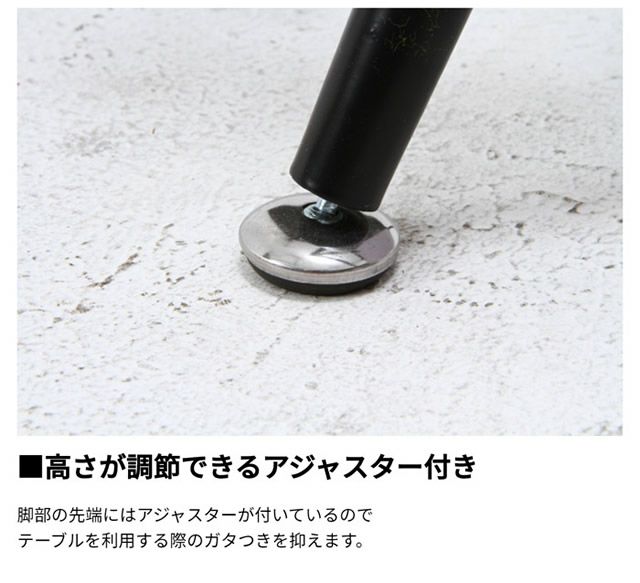 透明感のあるガラス天板で、中棚は天板の上からでも何が置いてあるのか確認が可能。脚部にはアジャスターが付いており、高さを調節すればガタつきを抑えてくれるため置く場所を選びません。