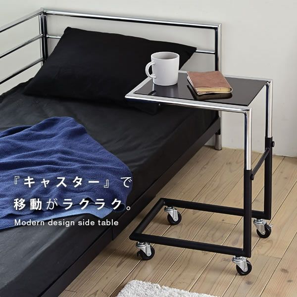 3段階高さ調整!キャスター付きブラックガラスサイドテーブル