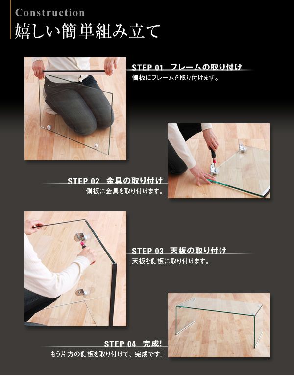 毎日使うものだから、耐久性は大切です。厚さ10mmの強化ガラスを天板のガラスだけでなく、側板にも同じ強化ガラスを使用しているので、安心してお使いいただけます。