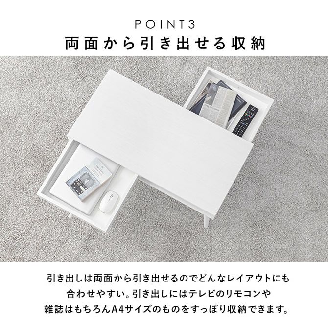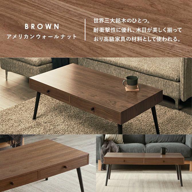 天然木の風合いを感じられるモダンなデザインのローテーブル。引き出しが2杯ついているので散らかりがちなテーブル周りも簡単上手に片付けが可能です。