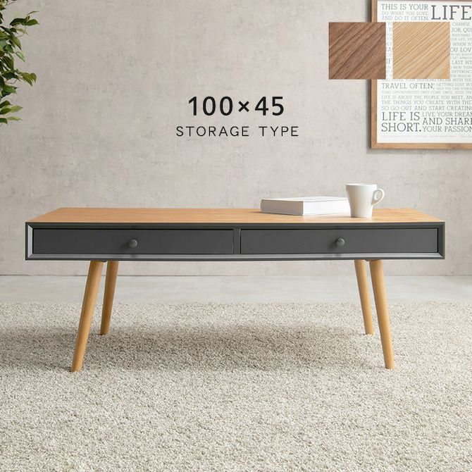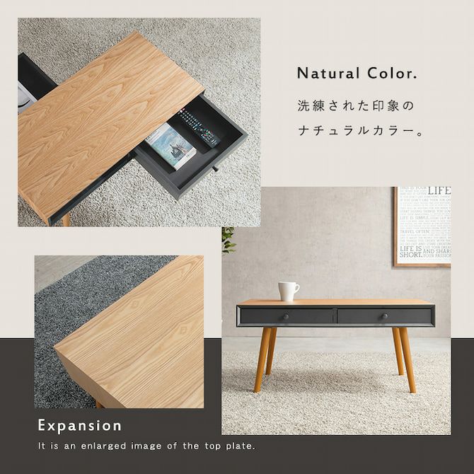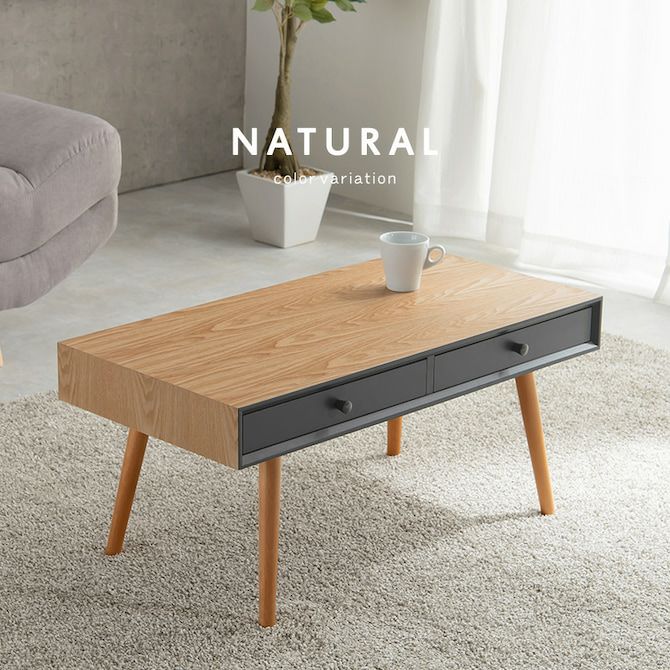 バイカラーがおしゃれな天然木センターテーブル 引き出し2杯タイプ