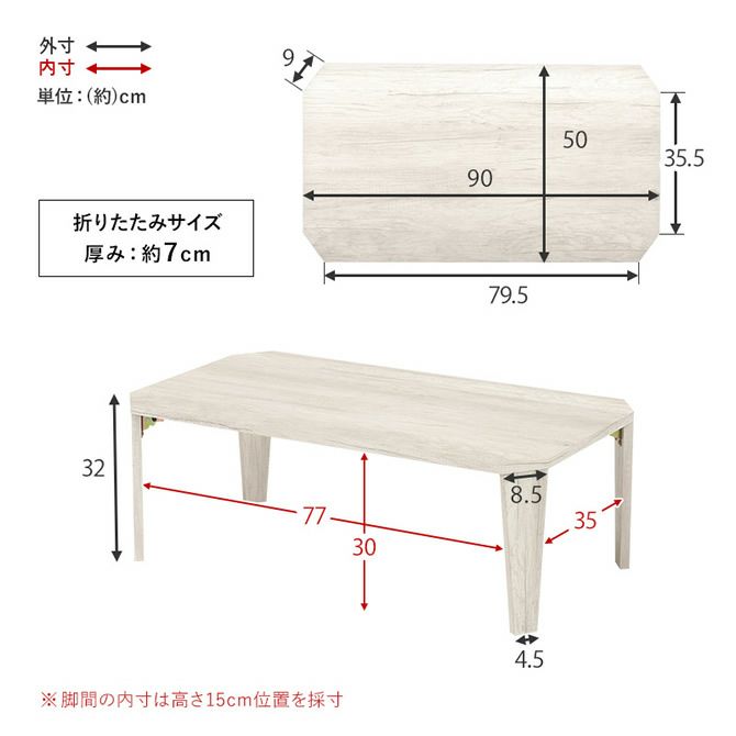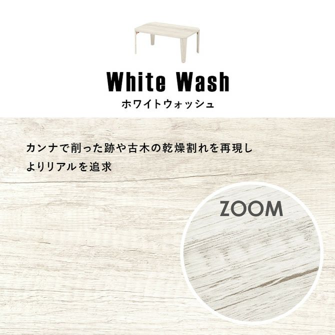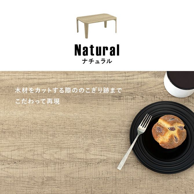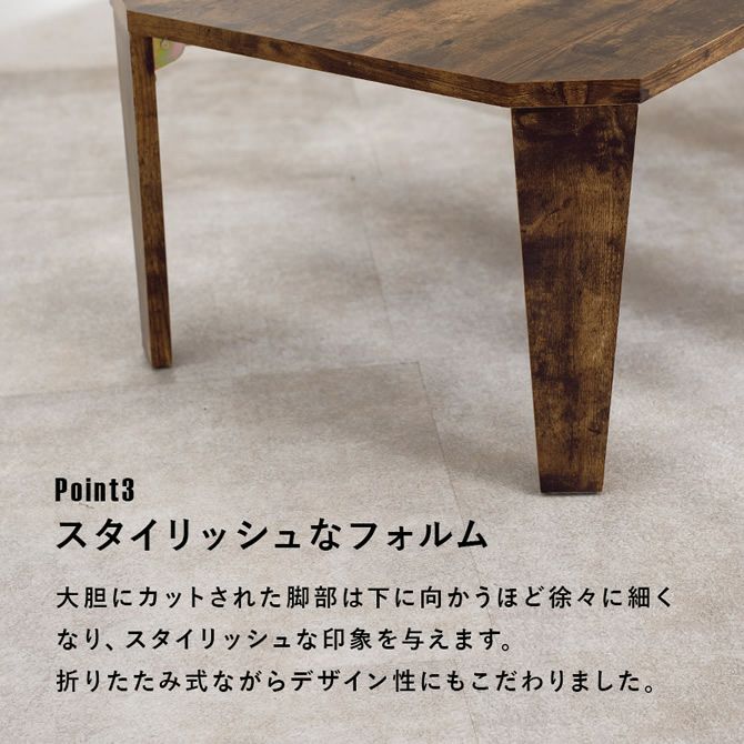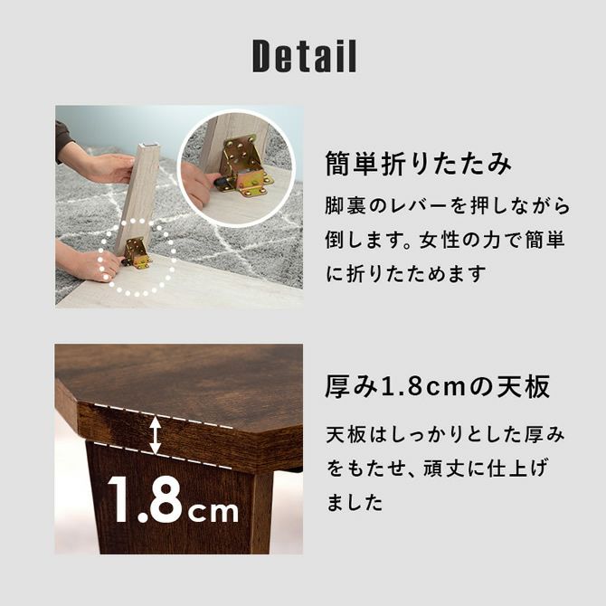 まるで天然木のような古木調の色合いと木目感の再現にこだわりました。脚部は折りたたみ機能付きなので、使用しない時は場所をとらずに収納できます。(写真は75×50cm)