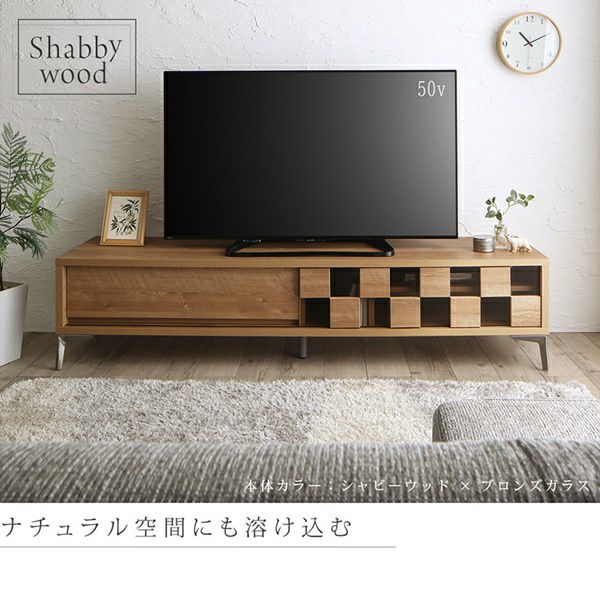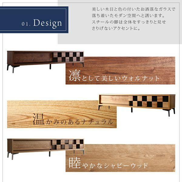 木目×ガラス部分の市松模様のデザインが特徴のテレビボード。高いデザイン性はもちろん、安心の国産品で細部の作りや収納などの基本機能も完備。完成品なので届いてすぐにお使い頂けます。