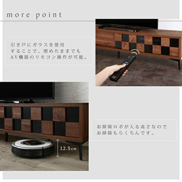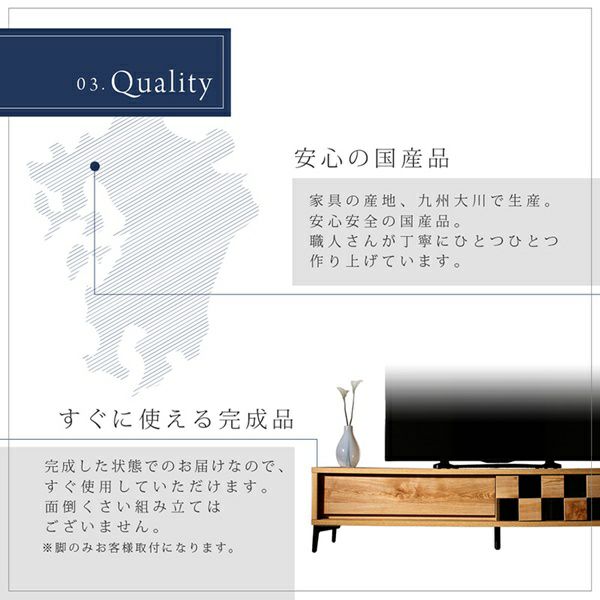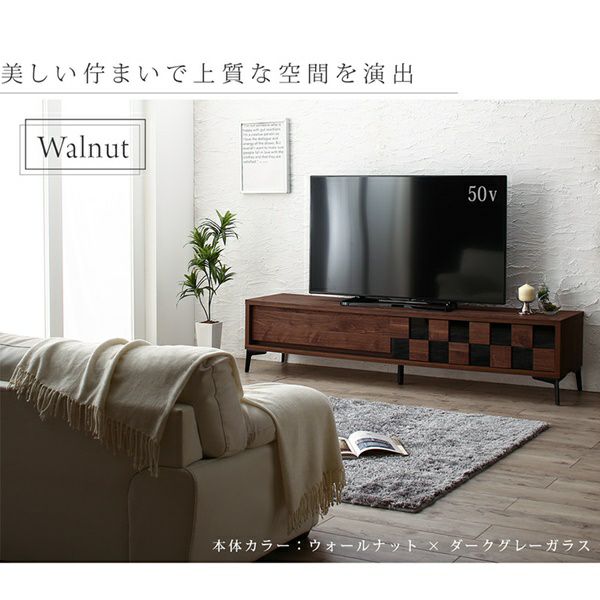 美しいウォルナット調の木目とモダンな黒ガラスの市松模様で落ち着いたモダンなお部屋へと誘います。約180cmの幅で大型テレビにも対応。家具の産地、九州で職人さんがひとつひとつ丁寧に作り上げた安心安全の国産品。面倒くさい組み立てもなくお届け後すぐ使用していただけます。※脚のみお客様取付となります。