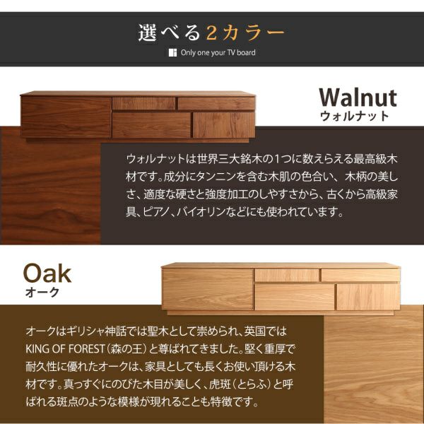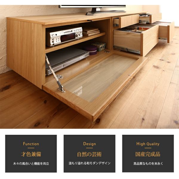 才色兼備 木々の風合いと機能を両立 雰囲気を壊さない上質な空間を創出 温もり溢れる和モダンデザイン 天然木の豊かな表情 選べる2カラー テレビが主役の充実機能 テレビ周りの物からリビング周りの小物まで充実の収納力 日本一の家具の町、福岡県大川市にて生産・低ホルムアルデヒド 組み立て不要のすぐに使える「完成品」
