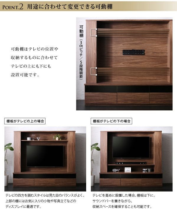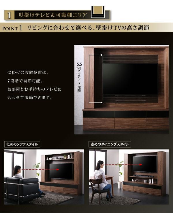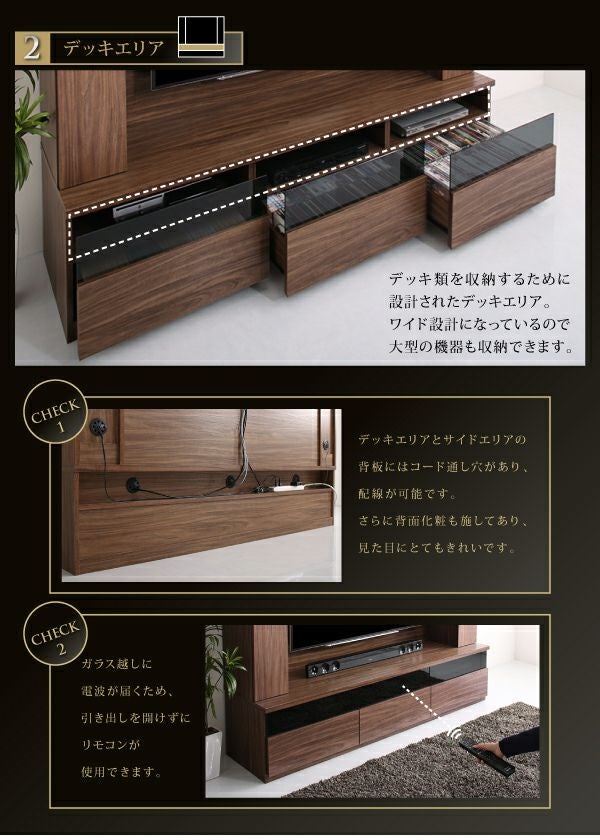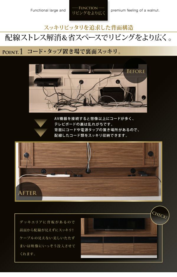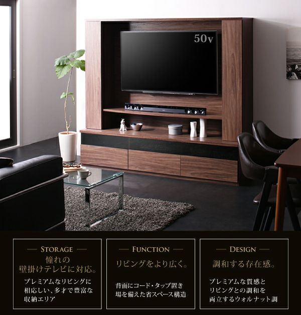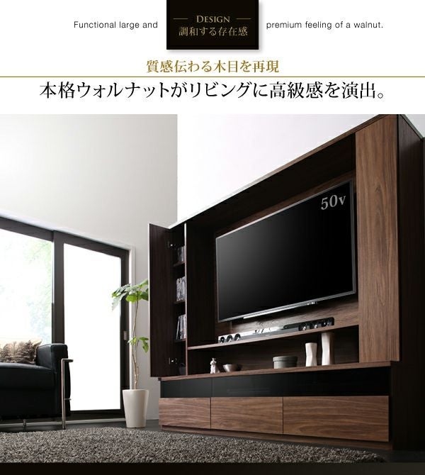 プレミアムなリビングに相応しい、多才で豊富な収納エリア。背面にコード・タップ置き場を備えた省スペース構造。プレミアムな質感とリビングとの調和を両立するウォルナット調。
