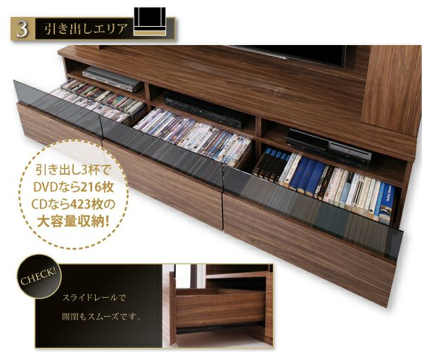 引き出し3杯でDVDなら216枚、CDなら423枚、の大容量収納!スライドレールで開閉もスムーズです。