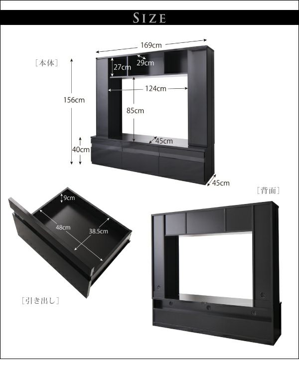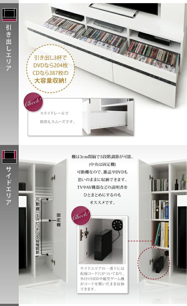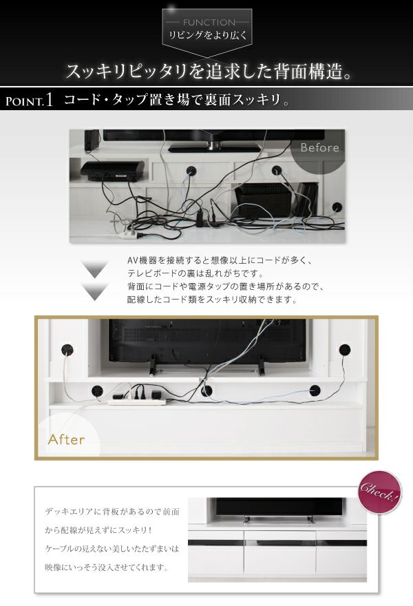 壁面を彩るモダンデザインと暮らしに寄り添う収納力を両立。背面にコード・タップ置き場を備えた省スペース構造。輝きを放つシャインホワイトと煌めく高級感のグロスブラックをご用意
